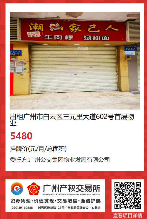 現有廣州市白云區三元里大道602號首層物業出租項目,該項目在廣州公有物業出租平臺網站自掛牌公開招租,歡迎有意向的企業法人或自然人(含個體工商戶)參加應租。現將有關事項說明如下: