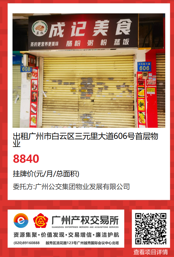 現(xiàn)有廣州市白云區(qū)三元里大道606號(hào)首層物業(yè)出租項(xiàng)目,該項(xiàng)目在廣州公有物業(yè)出租平臺(tái)網(wǎng)站自掛牌公開(kāi)招租,歡迎有意向的企業(yè)法人或自然人(含個(gè)體工商戶)參加應(yīng)租。現(xiàn)將有關(guān)事項(xiàng)說(shuō)明如下: