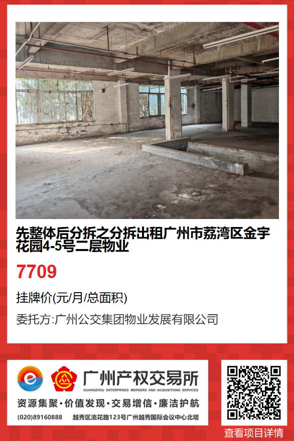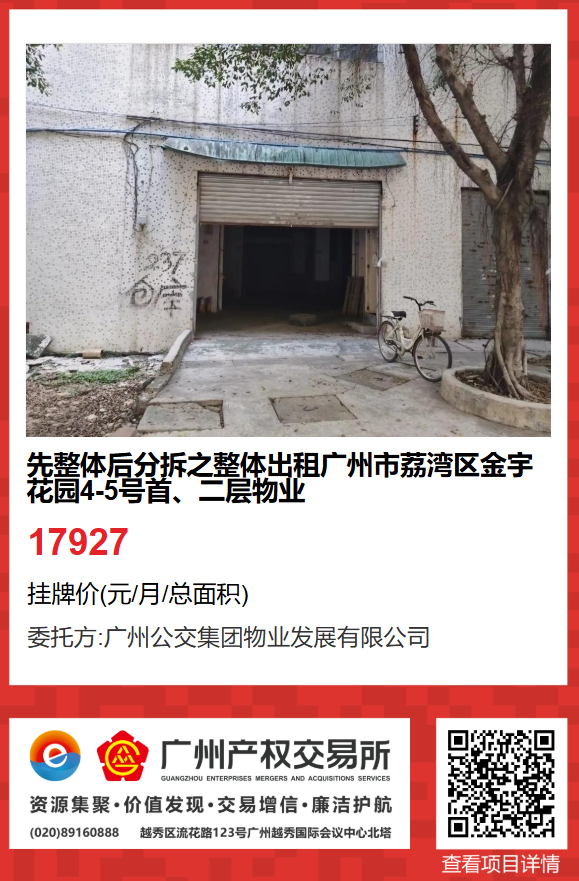1.整體掛牌項目為(項目1):先整體后分拆之整體出租廣州市荔灣區金宇花園4-5號首層、二層物業(項目編號:GZ2025RD1004615),出租面積為714.48㎡;