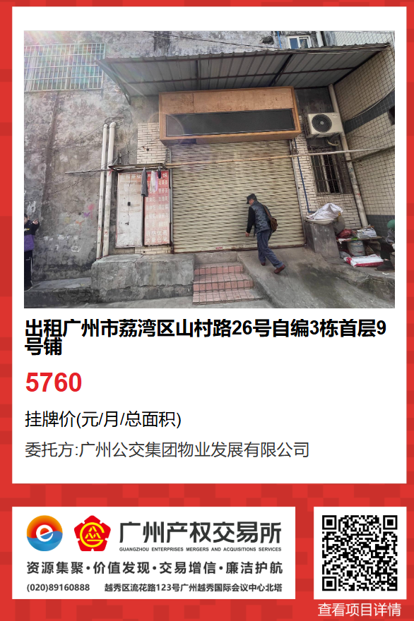 現有廣州市荔灣區山村路26號自編3棟首層9號鋪物業出租項目,該項目在廣州公有物業出租平臺網站自掛牌公開招租,歡迎有意向的企業法人或自然人(含個體工商戶)參加應租。現將有關事項說明如下: