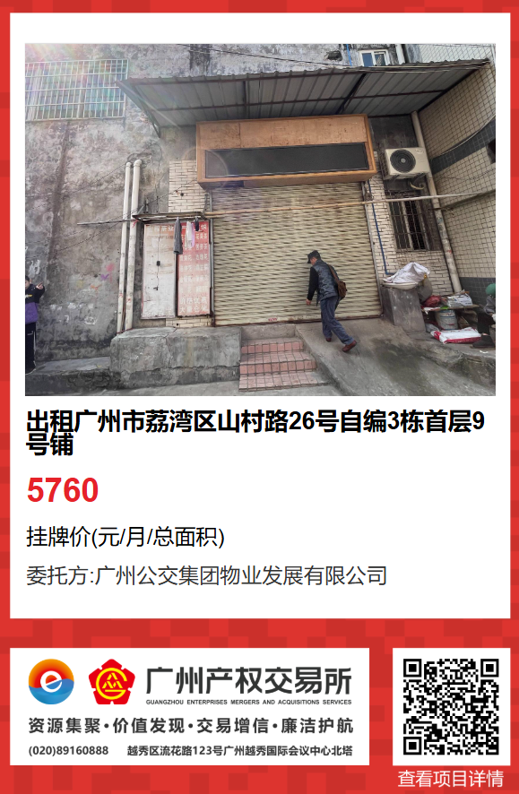 現有廣州市荔灣區山村路26號自編3棟首層9號鋪物業出租項目,該項目在廣州公有物業出租平臺網站自掛牌公開招租,歡迎有意向的企業法人或自然人(含個體工商戶)參加應租。現將有關事項說明如下:
