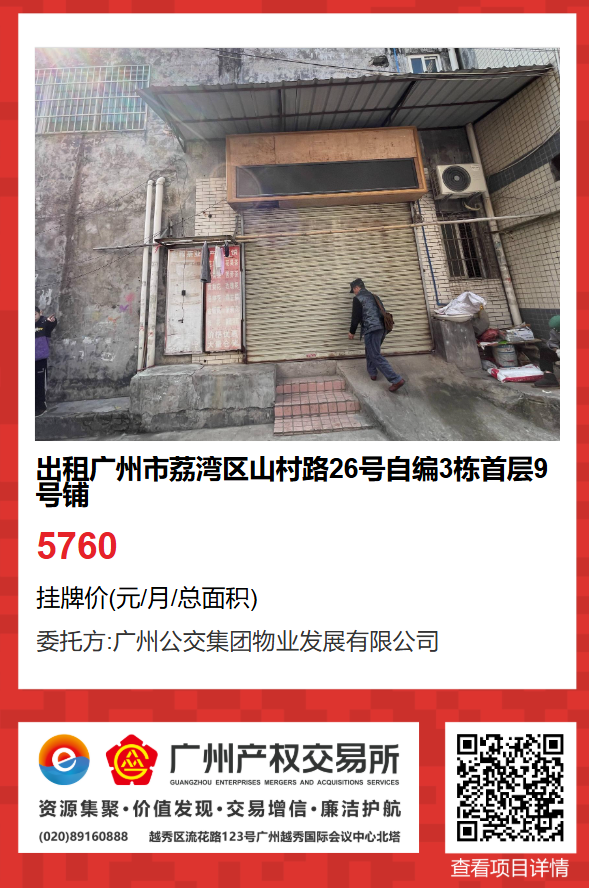 現有廣州市荔灣區山村路26號自編3棟首層9號鋪物業出租項目,該項目在廣州公有物業出租平臺網站自掛牌公開招租,歡迎有意向的企業法人或自然人(含個體工商戶)參加應租?,F將有關事項說明如下: