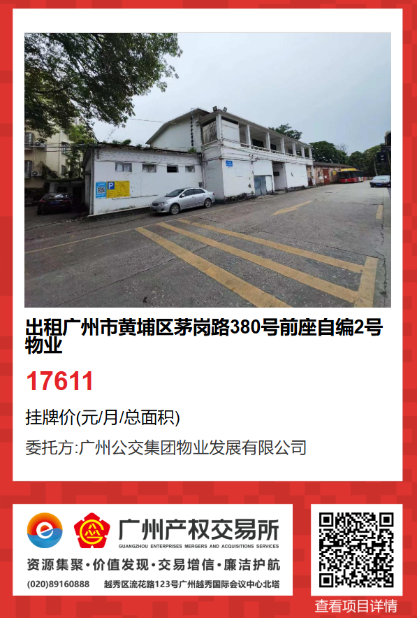 現有廣州市黃埔區茅崗路380號前座自編2號物業出租項目。該項目在廣州產權交易所網站掛牌公開招租,歡迎有意向的企業法人或自然人(含個體工商戶)參加應租?,F將有關事項說明如下: