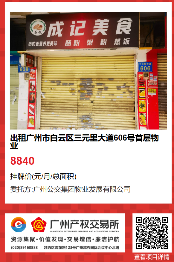現有廣州市白云區三元里大道606號首層物業出租項目,該項目在廣州公有物業出租平臺網站自掛牌公開招租,歡迎有意向的企業法人或自然人(含個體工商戶)參加應租?,F將有關事項說明如下: