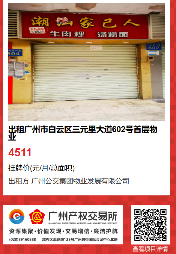 現有廣州市白云區三元里大道602號首層物業出租項目,該項目在廣州公有物業出租平臺網站自掛牌公開招租,歡迎有意向的企業法人或自然人(含個體工商戶)參加應租。現將有關事項說明如下: